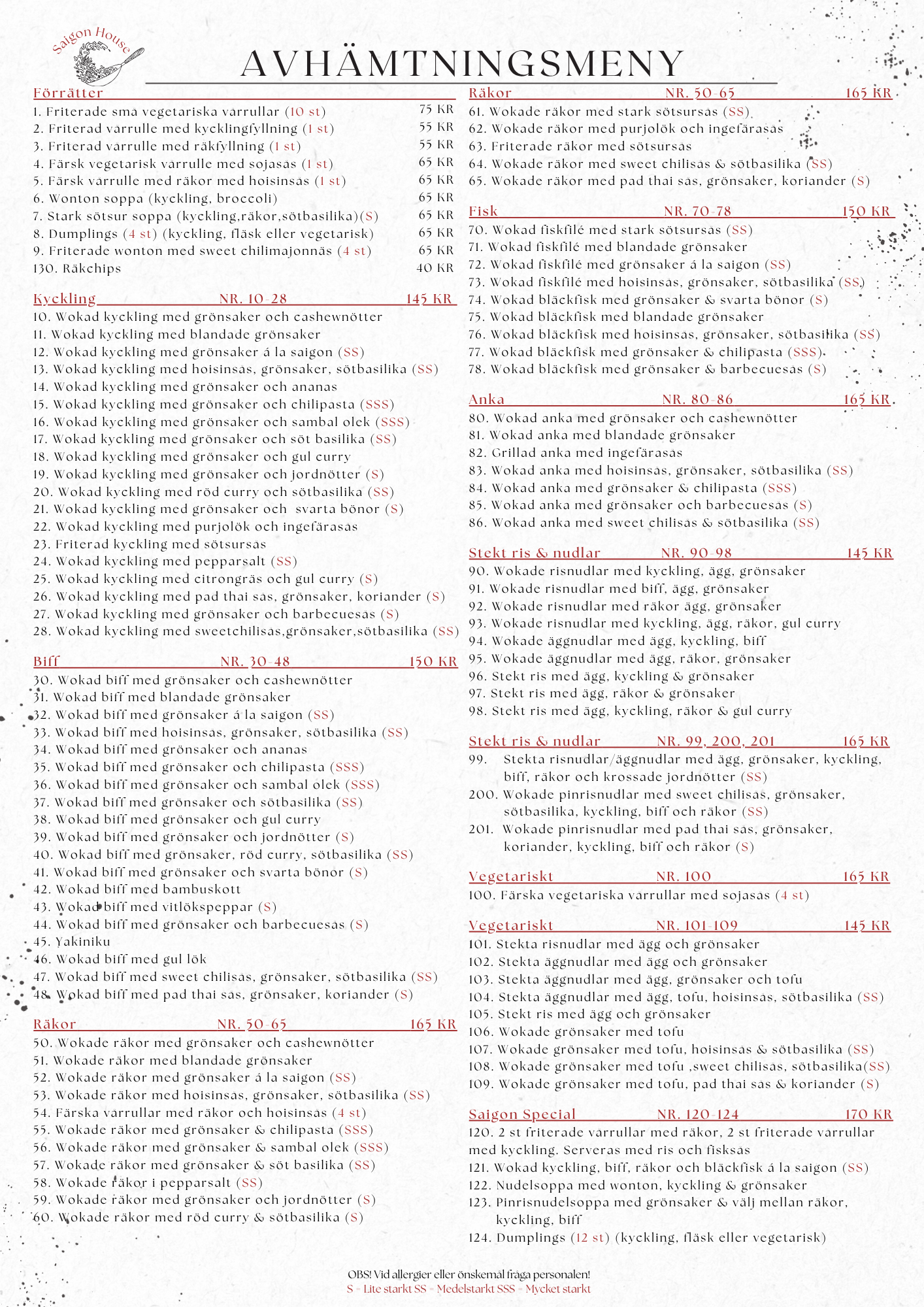 Saigon House erbjuder över 100 maträtter! Välj mellan olika rätter med kyckling, biff, räkor, anka eller fisk o bläckfisk. Det finns även helt vegetariska maträtter och testa även på nudelrätterna. Saigon House har även sina egna specialrätter som man kan välja!